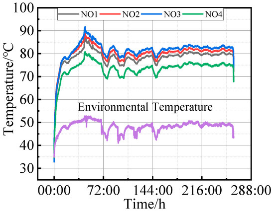 Figure 15 illustrates the temperature test results of the bearings in the experimental group. The graph indicates that the temperature steadily increased once the bearing load reached 95 kN. Subsequently, the temperature gradually decreased, followed by fluctuations around 78 °C. After some time, the temperature stabilized at 78 °C.