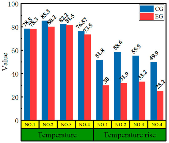 Figure 16 illustrates the data on the bearings’ average temperature and average temperature rise. The results show that the average temperature and average temperature increases for all bearings in the experimental group were lower than those in the control group. Specifically, the average temperature in the control group was 0.2–5.1 °C higher than that in the experimental group. However, the average temperature rise in the control group ranged between 21.8 and 26.7 °C. This difference could have been due to the impact of high ambient temperatures on the experimental group’s results. These temperature findings highlight the significant influence of the total circumferential clearance calculation method proposed in this study on reducing collisions and friction among rolling elements.