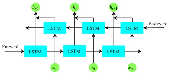 Although LSTM can effectively model time series data, it only considers forward time series when processing data and fails to pay attention to the impact of reverse time series data on the model. Bidirectional long short-term memory (BiLSTM) neural networks can obtain more contextual data through forward and backward propagation, thereby improving the understanding and modeling ability of time series data. Compared with unidirectional LSTM, its feature representation is more comprehensive and rich. Figure 2 illustrates the architecture of BiLSTM.
