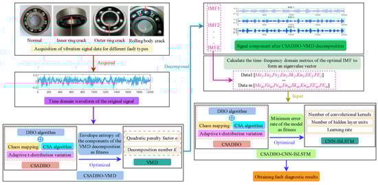The VMD optimization process based on the CSADBO algorithm is shown in Figure 4: