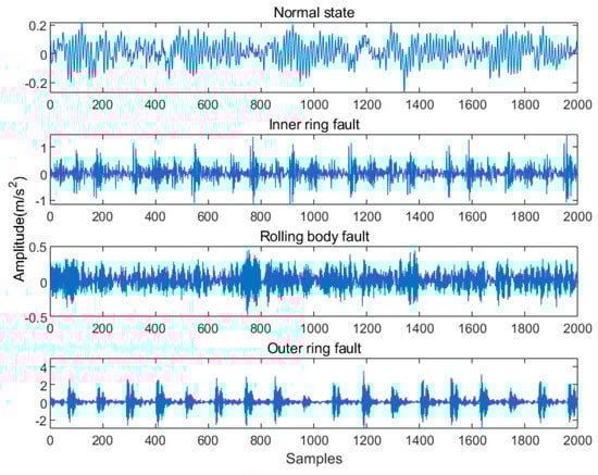 As one of the core components of rotating machinery, rolling bearings are widely used in industrial production. Rolling bearings play a role in transmission and support in rotating machinery, and their health status directly affects the performance and lifespan of mechanical equipment []. But due to the long-term operation of mechanical equipment under harsh and complex working conditions, the failure rate of rolling bearings is high. Once rolling bearings fail, it will lead to the inability of mechanical equipment to operate normally, and, in severe cases, it may even cause major accidents []. According to statistics, approximately 45% to 55% of rotating machinery failures are related to damage to rolling bearings []. It can be seen that, if rolling bearing faults can be identified and eliminated in a timely manner during the production process, it will greatly reduce the probability of equipment failure and reduce the later maintenance cost of the equipment. Therefore, studying how to efficiently and accurately detect rolling bearing faults is of great practical significance.