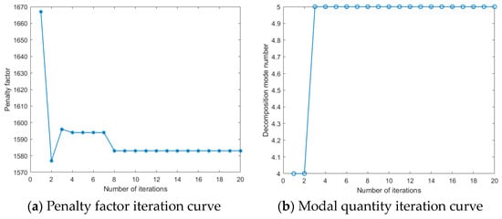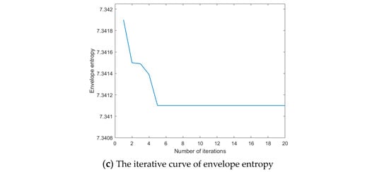 Due to the randomness of heuristic optimization algorithms, there may be some differences in the results of each iteration. This is because the population is reinitialized during each iteration, so the optimization results may not be completely consistent. Therefore, in order to maintain generality, this article takes the average of five experiments as the result. The experimental results are shown in Figure 10. From Figure 10a, it can be seen that the penalty factor has converged to the optimal value in the 8th iteration, and the final convergence value is 1583; Figure 10b shows the iteration curve of the number of modes, which has converged to the optimal value in the third iteration. The optimal number of mode decompositions is 5; Figure 10c shows the iteration curve of envelope entropy, which converges at the 5th iteration with a minimum envelope entropy of 7.3411.