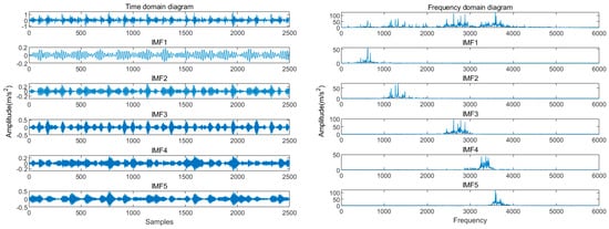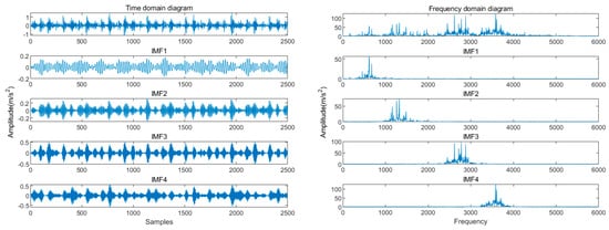 Therefore, the optimal parameter combination for the VMD algorithm can be obtained as [K, ] = [5, 1583], and then the optimal parameters are substituted into the VMD algorithm to perform modal decomposition on the inner ring fault signal. The decomposed result is shown in Figure 11. It can be clearly seen from Figure 11 that there is no modal aliasing phenomenon between the spectra of each component, which can be well used to describe the fault characteristics. In order to highlight the decomposition effect, a comparison was made with the decomposition effect of the artificially set parameter combination of [K, ] = [4, 2000] in Reference []. The decomposition results of the parameter combination of [4, 2000] are shown in Figure 12. By comparison, it can be seen that the optimized parameters in this article have an additional IMF4 component in the decomposition results. Based on the amplitude of the frequency domain diagram of the inner circle fault signal, the IMF4 component can be used to characterize the characteristics of the fault, while the IMF4 component is missing in Figure 12. Therefore, there is uncertainty in manually setting parameters, which can easily ignore the characteristics of the signal. This indicates that the optimized VMD algorithm in this article can effectively extract the features of fault signals.