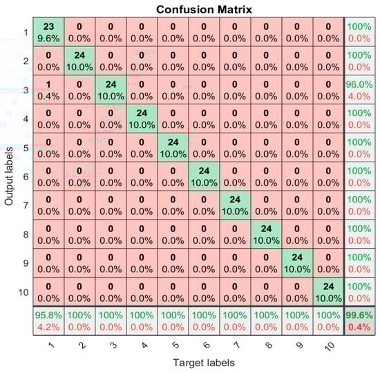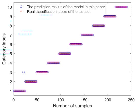 From Table 3, it can be seen that the optimal network parameters optimized by the CSADBO algorithm are as follows: the number of convolutional kernels = [12, 19], the number of hidden layer neurons = [80, 55], and the learning rate is 0.0238. After searching for the optimal parameters, the parameters are substituted back into the model for retraining, and then the fault diagnosis performance of the model is evaluated using the test set. Through experimental testing of the model, the optimization model described in this article shows fault classification results for ten states in Figure 13, and Figure 14 shows the confusion matrix of the fault diagnosis results. From Figure 13 and Figure 14, it can be seen that, out of 240 test samples, 239 were correctly classified, and only one normal sample was misclassified as an outer ring fault. The model achieved a recognition accuracy of 99.6% in the test set. From this, it can be seen that the CSADBO-VMD-CNN-BiLSTM model described in this article has a high recognition accuracy for fault classification of new and unprecedented data, good generalization ability, and excellent performance in rolling bearing fault diagnosis.
