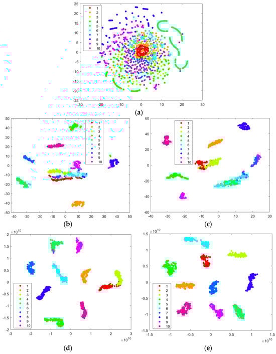 Visualization results of t-SNE: (a) the distribution of the original sample; (b) the distribution of samples after VMD; (c) the distribution of samples after CSADBO-VMD; (d) the distribution of samples after recognition by the CSADBO-VMD-CNN-BiLSTM model (where the hyperparameters of CNN-BiLSTM are not optimized); (e) the distribution of samples after model recognition in this article (optimizing hyperparameters for VMD and CNN-BiLSTM).
