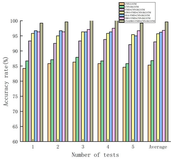 From Table 5, it can be seen that the accuracy of the CNN-LSTM model with the introduction of BiLSTM is improved by 1.5% compared to the traditional CNN-LSTM; the accuracy of fault classification using the VMD algorithm after signal preprocessing has been significantly improved. Compared to CNN-BiLSTM, the accuracy of the VMD-CNN-BiLSTM model has increased by 6.2%. However, due to the current suboptimal parameters of both VMD and CNN-BiLSTM models, there is still room for improvement in the accuracy of the model. When using the GWO, sparrow search algorithm (SSA) [], and DBO heuristic algorithms to simultaneously optimize hyperparameters of VMD and CNN-BiLSTM, each model showed excellent performance. GWO-VMD-CNN-BiLSTM, SSA-VMD-CNN-BiLSTM, and DBO-VMD-CNN-BiLSTM improved by 2.7%, 3.2%, and 3.8% compared to VMD-CNN-BiLSTM, respectively. It can be seen that the model optimized by parameters has higher diagnostic accuracy, and compared to the VMD-CNN-BiLSTM model optimized by the GWO and SSA algorithms, the model optimized by the DBO algorithm has better diagnostic accuracy. Better results were obtained after parameter optimization using the CSADBO algorithm described in this paper, and the diagnostic accuracy was improved by 2.8% compared to the model optimized by the DBO algorithm, with an average accuracy of 99.6%. Figure 17 shows the difference in diagnostic accuracy among different models, where the horizontal axis represents the results of five independent experiments and the average experimental results. When the CSADBO algorithm is used to optimize the parameters of VMD and CNN-BiLSTM simultaneously, the accuracy of fault diagnosis is the highest, fully proving the feasibility and superiority of the CSADBO-VMD-CNN-BiLSTM bearing fault diagnosis method described in this paper.