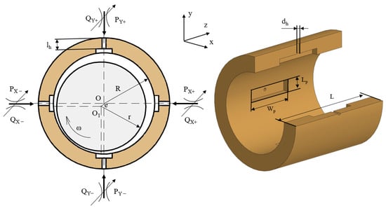 Equation (1) is solved numerically by the finite differences method [] together with Equations (2)–(4) resulting in the pressure distribution in the ALHB. The cavitation is taken into account based on the Gumbel’s hypothesis [,]. Numerical integration of the pressure distribution results in the following bearing forces: