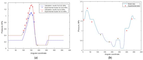 Verification of the model by comparison of predictions to the experimental data: (a) from [] on hydrodynamic pressure distribution; (b) from [] on hydrostatic pressure distribution.