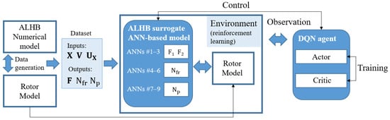 ALHBs can be represented by their numerical or ANN-based surrogate models predicting the set of parameters including (, , , , , ). The control signals and generated by a controller are the inputs of the ALHB models. Applying them results in a change in the shaft position in the bearing and the corresponding changes in other observed variables.
