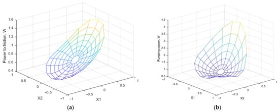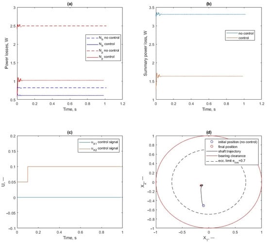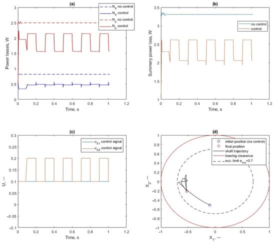 As can be seen from Figure 10a, the main contribution to this effect was made by the reduction in power losses for lubricant pumping. In this case, a comparison of the steady-state value of the shaft in Figure 10d with the diagram data in Figure 6 shows that this position is some distance from the minima of each of the parameters. The optimal ratio found in this way can be rebalanced by changing the weight coefficients for the parameters in Equation (17), as shown by Equation (13).
