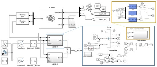 The simulation model of the rotor-bearing system was developed in the Simulink tool of the MatLab R2020b software. Simscape Multibody Toolbox was used to simulate rigid body dynamics. It was used to model a shaft on two ALHB operating in parallel. Reinforcement Learning Toolbox was used to implement the DQN controller training. The structure of the simulation model in Simulink is shown in Figure 7.