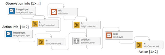In this study, a convolutional ANN with the structure shown in Figure 8 was used as a critic. The critic ANN shown consists of three hidden layers with 14, 18, and 18 neurons, respectively. The input parameters used during the training process are the observation parameters from the given time step and the control parameters from the previous time step. The critic’s output is the control signals vector . There are two parallel control loops (along and axes).