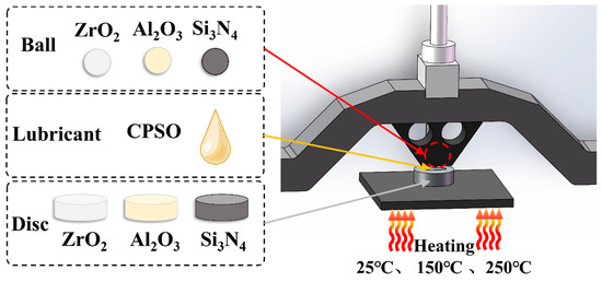 Tribological measurements in this research were conducted by a high-temperature reciprocating tribometer (SRV-4, Optimol, Munich, Germany). The objective of the ball-on-disc tribological experiments is shown in Figure 1. The experimental setup consisted of an upper ball (diameter 10.3 mm, surface roughness RaZrO2 = 8 nm, RaAl2O3 = 6 nm, RaSi3N4 = 5 nm) and a ceramic disc (Φ24 mm × 7.88 mm). The test condition was set to 50 Hz, a 1 mm stroke, and 60 min duration, under a normal load of 50 N (resulting in a Hertz contact pressure of 1.71–2.45 GPa). Temperatures of 25 °C, 150 °C, and 250 °C were chosen to replicate the severe conditions of a high-temperature environment. The wear rates of the samples were calculated using the following equation: R = V/N × S, where R is the wear rate (mm3/Nm), V is the wear volume (mm3), N is the normal load (N), and S is the sliding distance (m). Prior to testing, ceramic discs were ultrasonically cleaned in anhydrous ethanol, petroleum ether, and acetone for 15 min.