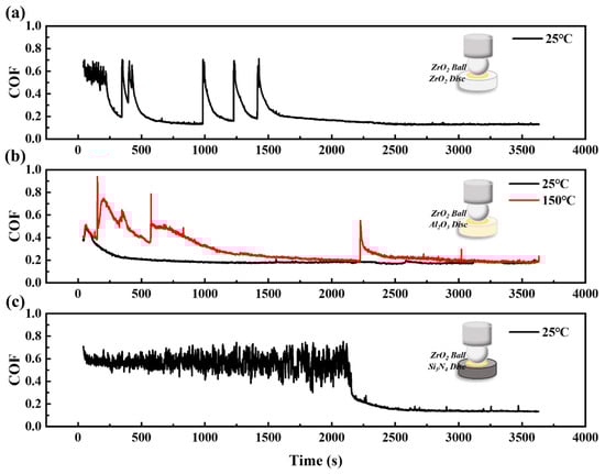 The coefficient of friction curves of CPSO under (a) ZrO2/ZrO2, (b) ZrO2/Al2O3, (c) ZrO2/Si3N4 ceramic tribo-systems at 25 °C, 150 °C.