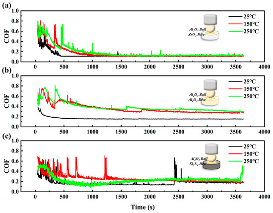 The coefficient of friction curves of CPSO under (a) Al2O3/ZrO2, (b) Al2O3/Al2O3, (c) Al2O3/Si3N4 ceramic tribo-systems at 25 °C, 150 °C, and 250 °C.