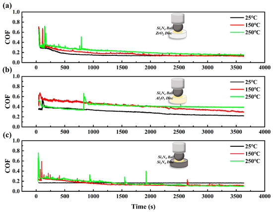 The coefficient of friction curves of CPSO under (a) Si3N4/ZrO2, (b) Si3N4/Al2O3, (c) Si3N4/Si3N4 ceramic tribo-systems at 25 °C, 150 °C, and 250 °C.