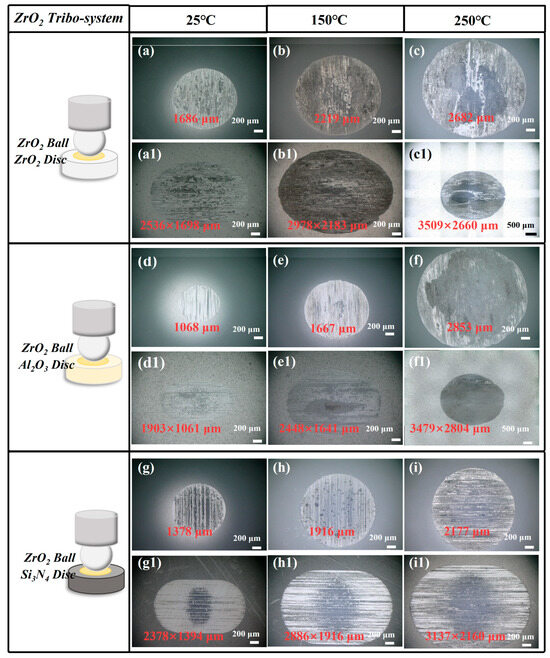 (a–i) Wear scar of ZrO2 ball and (a1–i1) ceramic disc under CPSO as lubricant at 25 °C, 150 °C, and 250 °C with ZrO2 ceramic tribo-system.