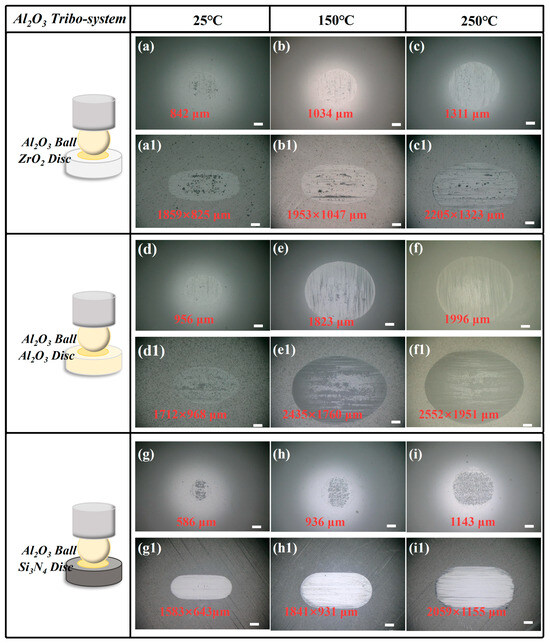 (a–i) Wear scar of Al2O3 ball and (a1–i1) ceramic disc under CPSO as lubricant at 25 °C, 150 °C, and 250 °C with Al2O3 ceramic tribo-system; all scale bars are 200 μm.