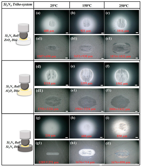 (a–i) Wear scar of Si3N4 ball and (a1–i1) ceramic disc under CPSO as lubricant at 25 °C, 150 °C, and 250 °C with Si3N4 ceramic tribo-system; all scale bars are 200 μm.