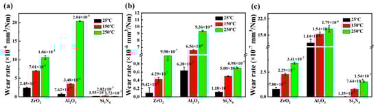 In the Al2O3 tribo-system, as shown in Figure 9b, the wear rate of the Al2O3/ZrO2 tribo-pair significantly escalated, moving from 9.42 × 10−8 mm3/Nm at 25 °C to 9.98 × 10−7 mm3/Nm, which represents an increase of 959.45%. For the Al2O3/Al2O3, there was a marked increase in wear rate from 6.38 × 10−7 mm3/Nm at 25 °C to 9.36 × 10−6 mm3/Nm, a substantial growth of 1367.01%. In the case of the Al2O3/Si3N4 tribo-pair, the wear rate rose from 1.18 × 10−7 mm3/Nm to 6.98 × 10−7 mm3/Nm, an increase of 491.53%.