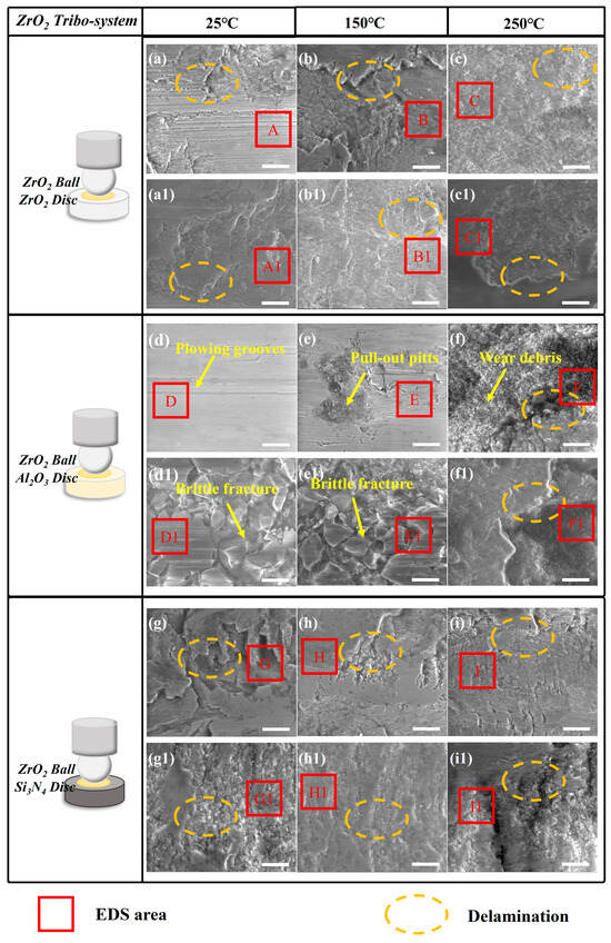 The SEM results of (a–i) the ZrO2 ceramic ball, (a1–c1) ZrO2 ceramic disc, (d1–f1) Al2O3 ceramic disc, and (g1–i1) Si3N4 ceramic disc under CPSO as a lubricant at 25 °C, 150 °C, and 250 °C; the relative movement direction of the mated interface is horizontal in each picture; all the scale bars are 10 μm.