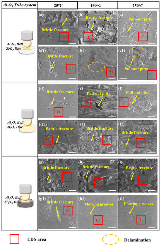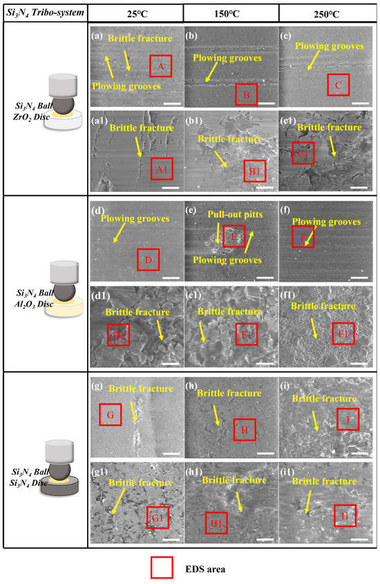 The SEM results of (a–i) the Al2O3 ceramic ball, (a1–c1) ZrO2 ceramic disc, (d1–f1) Al2O3 ceramic disc, and (g1–i1) Si3N4 ceramic disc under CPSO as a lubricant at 25 °C, 150 °C, and 250 °C; the relative movement direction of the mated interface is horizontal in each picture; all the scale bars are 10 μm.