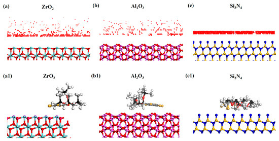 Potential adsorption sites of CPSO molecular model on different surfaces of (a) ZrO2 (1 1 1), (b) Al2O3 (1 −1 2), (c) Si3N4 (0 0 2), and adsorption configurations of CPSO on different surfaces of (a1) ZrO2 (1 1 1), (b1) Al2O3 (1 −1 2), (c1) Si3N4 (0 0 2). Zr (light blue), O (red), Al (purple), N (dark blue), Si-Si3N4 (light yellow), Si-CPSO (black), C (grey), Cl (light orange), H (white).
