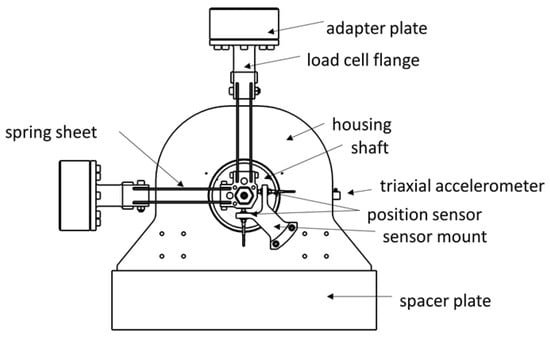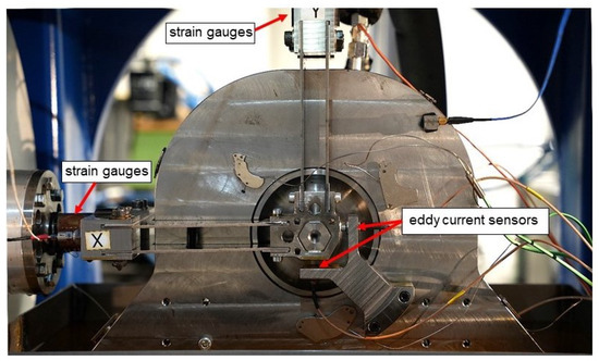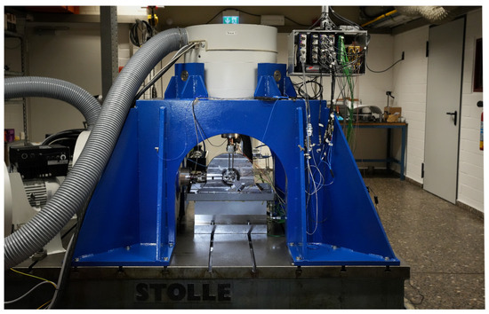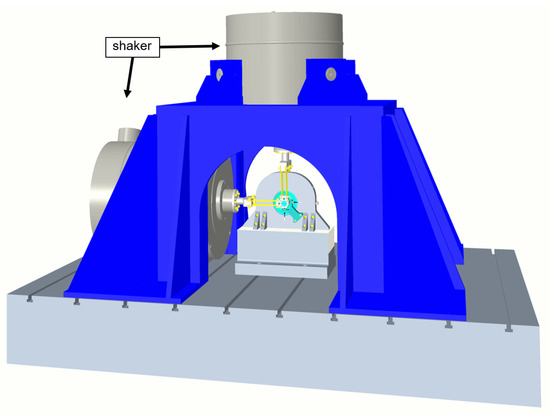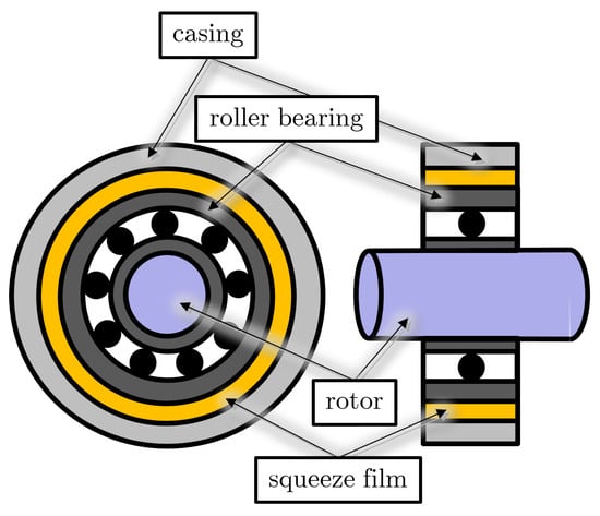 Despite the significant efforts to understand and mathematically describe the mechanics of squeeze film damping, the SFD system is complicated and—in the presence of piston ring sealing and deep circumferential grooves—exhibits areas which are not yet well understood and analyzed. An experimental validation is therefore imperative to demonstrate the benefits and shortcomings of the analytical techniques employed. In Figure 7, a novel test rig, operated at the University of Kassel (UKS), is shown in order to perform full-scale tests of squeeze film dampers (SFD). It consists of a shaft that is enabled by the design of the suspension to perform an orbital motion.