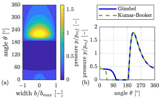 where h is the gap function and is the pressure distribution. The x-coordinate represents the circumferential direction and the y-coordinate represents the axial direction of the SFD. The Reynolds equation balances the fluid flows caused by pressure gradients on the left-hand side of the equation and by shearing, density changes and squeezing on the right-hand side. Figure 3a shows the pressure distribution in the oil of an SFD, where the cavitation area is determined by the Kumar–Booker algorithm. Figure 3b compares the pressure distribution over the circumferential coordinate at the axial centerline . The Kumar–Booker algorithm provides the spatial and temporal evolution of the the cavitation area. The size of the cavitation area can have a large effect on the pressure distribution and therefore on the hydrodynamic bearing forces. Due to mass conservation, the Kumar–Booker model is required to determine the oil flow out of the SFD. Therefore, all experimental results are compared with the simulation results using the Kumar–Booker cavitation model.