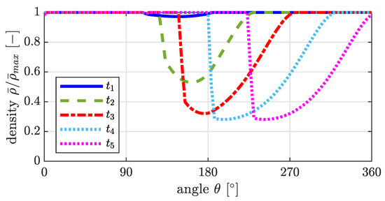 Figure 4 shows the evolution of the density in the SFD over the circumferential coordinate at the axial centerline . At the beginning of the orbit at time , the gap is completely filled with oil. In this case, the density and the cavitation area evolve within a third of an orbit ( to ) and from then on follow the high-pressure field, only changing their position according to the orbit (compare and ).