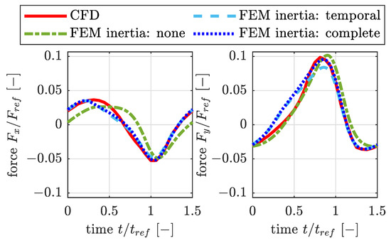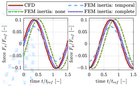 FEM solutions without any inertia effects, with temporal inertia effects only and with complete (temporal + convective) inertia effects are generated. The FEM solution without inertia effects has almost the same amplitude as the FEM solution with complete inertia, but there is a phase shift between these two solutions. The complete inertia model shows a better agreement with the 3D-CFD results. The temporal inertia model shows the largest deviation from the 3D-CFD results in this case. In Figure 6, the same comparison is performed as in Figure 5 but with an off-centered orbit.