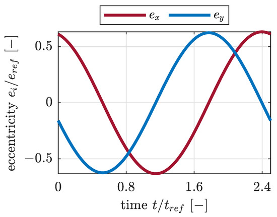 The comparison of measurement and simulation covers the range of one orbit around a slightly off-centered position (see Figure 11). The amplitudes of the measured eccentricities in both directions, x and y, are almost equal, which means the orbit is more circular than elliptical. The phase shift between and is .