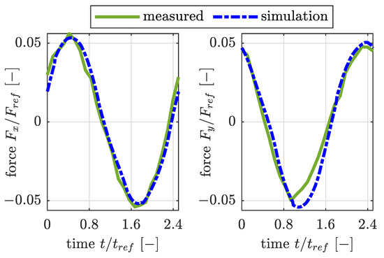 For the given motion as given in Figure 11, both the resulting forces within the experiment and the calculated forces from the simulation can be compared. Figure 13 shows a good correlation of measurement and simulation for and . Except for the deviation around , amplitude matches well and the phase is almost identical.