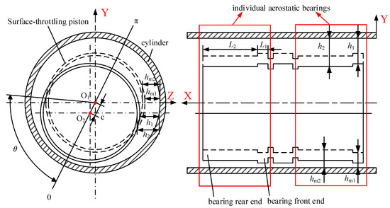 The surface-throttling piston used in this study consists of two individual aerostatic bearings with identical structural dimensions. To simplify calculations, subsequent analysis will focus solely on a single aerostatic bearing of the piston, as depicted in Figure 2. The coordinate system is represented by capital letters XYZ, where the X-axis represents the width direction of the air film, Y-axis and Z-axis represent the thickness direction of the air film.