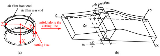 When the aerostatic bearing deflects radially under external force, the thickness of the air film at each point in the circumferential direction varies, as illustrated in Figure 3b. The air film computational domain is uniformly divided into n equal parts in the z direction. According to Equations (6) and (7), the thickness of the air film at each node in each column can be expressed as follows: