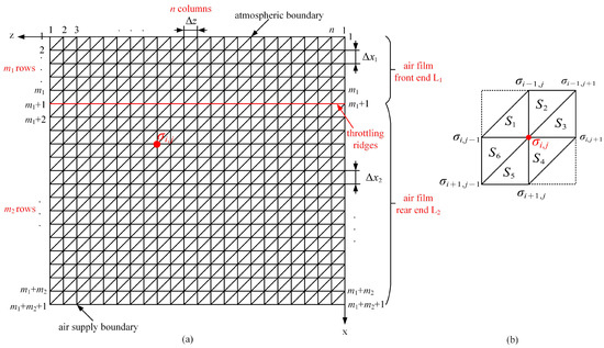 The expanded air film between the aerostatic bearings is divided uniformly in the x and z directions into (m1 + m2) and n equal parts, respectively, as illustrated in Figure 4a. The entire computational domain is partitioned into 2n·(m1 + m2) linear triangular elements. The upper boundary of the computational domain corresponds to the atmospheric boundary, while the lower boundary corresponds to the air supply boundary. Therefore, there are n·(m1 + m2 − 1) unknown nodes in the entire computational domain. Figure 4b depicts six linear elements Sk (k = 1, 2, …, 6) associated with any node σi,j (2 ≤ I ≤ m1 + m2, 1 ≤ j ≤ n) in the air film computational domain, where i denotes the row number of the node, and j denotes the column number of the node.