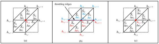 In solving the Reynolds equation using FEM, the thickness of the air film at each node in the computational domain depends on the thickness of the air film in the element to which it belongs. When all elements are located at the front end of the air film, as shown in Figure 5a, the thickness of the air film at the nodes of these elements is determined by the thickness h1,j of the air film at the front end, and the area of the elements is represented by Δe1. For nodes located at the throttling ridges, as illustrated in Figure 5b, the thickness of the air film is specified as follows: when the element (S1, S2, S3) to which the node σi,j belongs is located at the front end of the air film, the thickness of the air film at that node is h1,j, and the area of the element is Δe1; when the element (S4, S5, S6) to which the node σi,j belongs is located at the rear end of the air film, the thickness of the air film at that node is h2,j, and the area of the element is Δe2. When all elements are located at the rear end of the air film, as depicted in Figure 5c, the thickness of the air film at the nodes of these elements is determined by the thickness h2,j of the air film at the rear end, and the area of the elements is represented by Δe2.