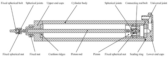 The structure of the surface-throttling frictionless pneumatic cylinder is illustrated in Figure 7. The cylinder structure consists of upper and lower end caps, cushion ridges, cylinder body, piston, piston rod, and so forth. Spherical joints are employed at both ends of the piston rod, facilitating the assembly adjustment between the piston rod and the vertical axis connection components of the ultra-precision machine tools. This design reduces the coaxiality requirements between the piston rod and the vertical axis connection components of traditional frictionless cylinders. Additionally, it prevents the swinging of the piston caused by the straightness error of the vertical axis, ensuring the stable operation of the cylinder.