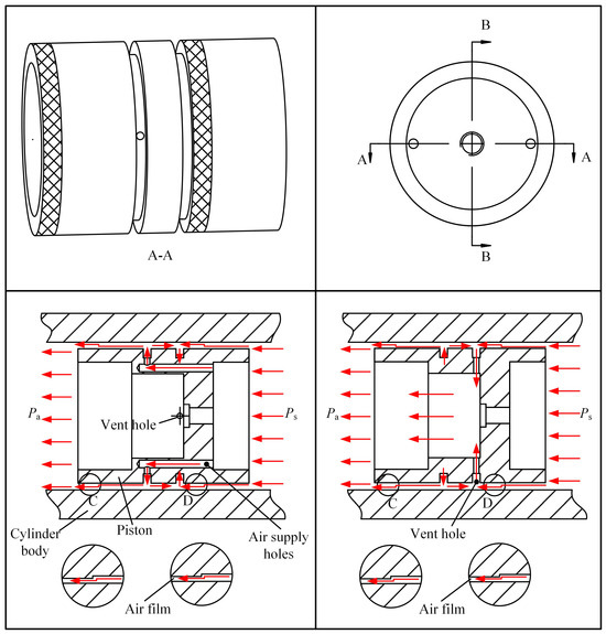 As shown in Figure 8, during the operation of the frictionless pneumatic cylinder, high-pressure air enters the cylinder through the lower end cap. A portion of the air flows into the gap between the piston and the cylinder body through the air supply holes on the piston, while the majority of the air passes through the surface-throttling ridges at point C on the piston surface, forming a pressure film through surface-throttling, and then continues to move upward and is discharged directly from the cylinder body. A small amount of air moves downward and enters the interior of the piston through the vent holes before being discharged from the cylinder body. Another portion of the air enters the gap between the piston and the cylinder body directly from the bottom of the piston. It then passes through the surface-throttling ridges at point D on the piston surface, forming a pressure film through surface-throttling, and moves upward to enter the interior of the piston through the vent holes before being discharged from the cylinder body.