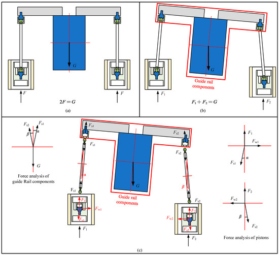 Static equilibrium calculation of dual-cylinder system: (a) Dual-cylinder system in an ideal condition; (b) Dual-cylinder system in the actual condition; (c) Static equilibrium calculation of dual-cylinder system in the actual condition.