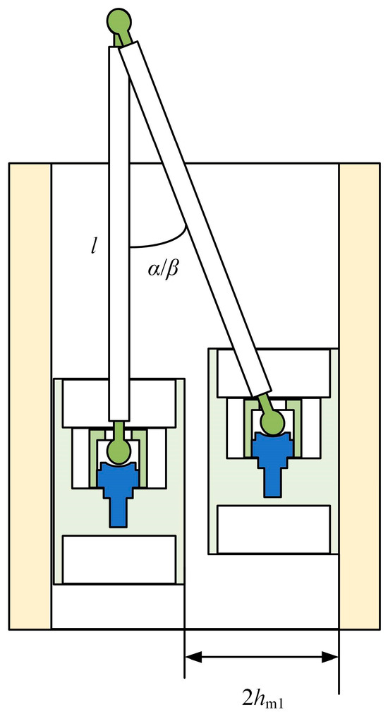 Furthermore, as illustrated in Figure 10, the minimum gap between the piston and the cylinder wall is the average thickness hm1 of the air film at the front end of the aerostatic bearing. Assuming the length of the piston rod is l, the maximum angular displacement of the piston driven by the piston rod between the inner walls of the cylinder is as follows: