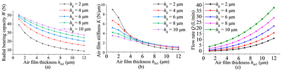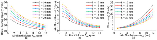 Under conditions where other parameters are fixed, the influence of different air film thicknesses hm1 and total length L on the static characteristics is discussed at a constant eccentricity. From Figure 14a,b, it can be observed that both the bearing capacity and stiffness of the bearing decrease with increasing air film thickness. When the air film thickness is constant, increasing the total length of the bearing leads to a gradual increase in both bearing capacity and stiffness. Figure 14c shows the curve of the total length of the bearing on the flow rate, where the flow rate increases with increasing air film thickness. When the air film thickness is constant, the flow rate decreases with increasing total length of the bearing.