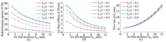 Under conditions where other parameters are fixed, the influence of different air film thicknesses hm1 and groove length ratio L2/L on the static characteristics is discussed at a constant eccentricity. From Figure 13a,b, it can be observed that both the bearing capacity and stiffness of the bearing decrease with increasing air film thickness. When the air film thickness is constant, increasing the groove length ratio initially increases both the bearing capacity and stiffness, followed by a decrease. Figure 13c shows the curve of the groove length ratio L2/L on the flow rate, where the flow rate increases with increasing air film thickness. When the air film thickness is constant, the flow rate decreases with increasing groove length ratio.