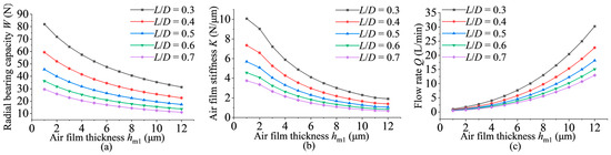 Influence of length-to-diameter ratio on bearing static performance: (a) Variation curve of radial bearing capacity with air film thickness at different length-to-diameter ratios; (b) Variation curve of stiffness with air film thickness at different length-to-diameter ratios; (c) Variation curve of flow rate with air film thickness at different length-to-diameter ratios.