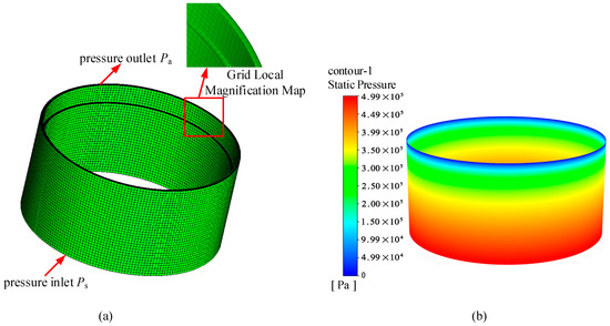 To validate the reliability of the FEM proposed in this paper for surface-throttling aerostatic bearings, the existing CFD calculation was utilized to calculate the radial bearing capacity and flow rate of the surface-throttling aerostatic bearings under different eccentricity conditions, while keeping other computational parameters consistent with chapter three. The specific steps are as follows: Firstly, the three-dimensional model of the aerostatic bearing fluid domain under zero-eccentricity condition was constructed. Hexahedral elements were then used for meshing, with mesh refinement applied at the pressure inlet, pressure outlet, and throttling protrusion to ensure resultsaccuracy. The meshed CFD model and boundary conditions are depicted in Figure 16a. Subsequently, CFD software was employed to set up and analyze the aerostatic bearing. The pressure inlet was set to 0.5 MPa, and the pressure outlet boundary condition was atmospheric pressure. The resulting pressure distribution is shown in Figure 16b. This process was repeated for different eccentricity values.