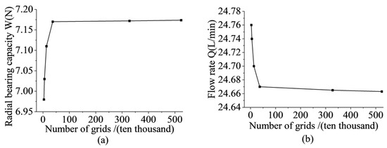 Mesh independence test: (a) Radial bearing capacity simulation grid independence curve; (b) Flow rate simulation grid independence curve.