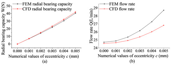 Comparison between CFD calculation and FEM: (a) Comparison of radial bearing capacity between CFD calculation and FEM at different eccentricities; (b) Comparison of flow rates between CFD calculation and FEM at different eccentricities.
