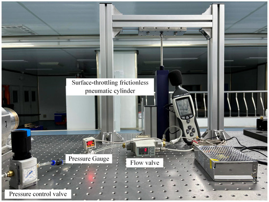 To validate the accuracy of the results, a test rig was specifically constructed to evaluate the performance of the frictionless pneumatic cylinder. When the bearing operates normally, the radial bearing capacity exists within the frictionless pneumatic cylinder and cannot be directly measured. Therefore, the experiment verified the data by measuring the flow rate of the frictionless pneumatic cylinder under different pressures. The test rig of the flow rate detection device for the frictionless pneumatic cylinder is depicted in Figure 19.