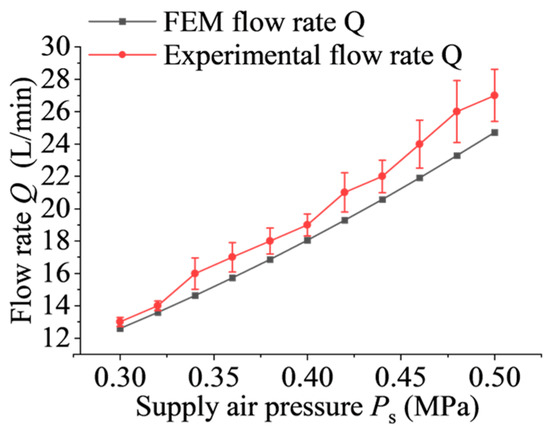 The experimental data on the variation of flow rate with supply air pressure for the aerostatic bearings were obtained, and the results were compared with those obtained from the improved FEM proposed in this paper, as shown in Figure 20. It can be observed that the experimentally measured flow rate generally corresponds to the trends predicted by the improved FEM, with minor discrepancies in local numerical values. The maximum error in flow rate is 10%, which falls within an acceptable range of deviation. Therefore, the proposed improvement to the FEM for surface-throttling aerostatic bearings exhibits reliability.