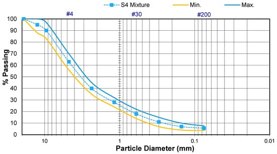 This section presents the details of field data collection via two devices on an asphalt pavement. With traffic control, this study collected pavement texture and friction data on two field sections from the Country Club Road in Stillwater, Oklahoma, USA, in 2022. The roadway was constructed with asphalt concrete (AC) using an asphalt binder of PG 70–28 and an aggregate combination of 23% 3/4″ Chips + 28% Mine Chat + 15% Man. Sand + 19% Scrns + 14% Sand + 1% B.H.Fines. Per Table 1, the laboratory testing result showed that the aggregate and asphalt mixture used on that AC roadway had good performance to meet the agency’s requirements. In addition, the gradation of the S4 mixture used on that AC roadway satisfied the agency’s gradation requirements, as shown in Figure 1.